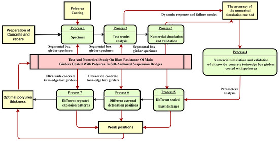 In this study, three blast tests were conducted on two identical scaled-down (1:3) specimens of a typical single-box, triple-chamber concrete box girder, based on an actual bridge engineering background. The tests involved two 3 kg of TNT charges and one 5 kg TNT charge. The specimens were designated as G (box girder without polyurea), PCG (box girder coated with polyurea, first detonation), and PCGR (box girder coated with polyurea, second detonation). A comparative analysis was performed to examine the damage characteristics and dynamic response of specimens G, PCG, and PCGR. Simulations were performed utilizing the LS-DYNA software to investigate the damage behavior of concrete box girders coated with polyurea under near-field blast loads. The blast response of polyurea-coated wide box girders was analyzed considering variations in standoff distance, charge position, and detonation method. The findings provide insights that could serve as a reference for the blast-resistant design of bridges. The technical flowchart of this study is shown in Figure 1.
