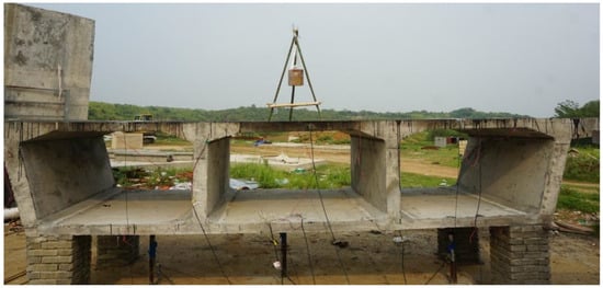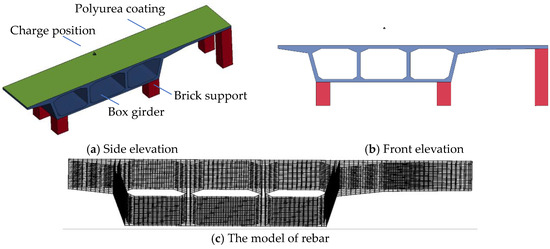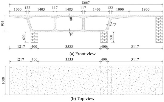 In this study, two 1:3 scale segment specimens were fabricated based on the Shandong Hunan Road Bridge [29], with dimensions provided in Figure 2. The experimental model consists of two parts: a reinforced concrete box girder and six 400 mm × 400 mm brick masonry support columns. Four of the masonry supports beneath the box segment are 600 mm in height, while two supports beneath the long cantilever end are 1453 mm in height. Cement mortar was used to adhere and secure the box girder and masonry supports. Since the primary objective of this test is to assess the dynamic response and failure characteristics of the box girder segment under blast loading [30], the constraints applied to the specimen do not fully replicate real bridge conditions, but they are adequate for model validation.