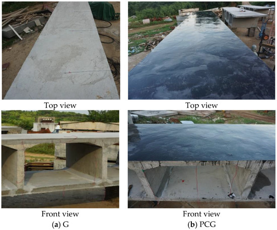 The polyurea elastomer used in this study was sourced from Shaanxi Juao Building Materials Co., Ltd. (Xi’an, China) [31]. First, the top surface of the PCG box girder specimen was cleaned, and the polyurea mixture was applied to the top plate of the PCG specimen with a thickness controlled at 1.5 mm [32]. The real-world conditions of the segmental box girder specimens G and PCG are depicted in Figure 3. Specimen PCGR was used for the second detonation test following the initial detonation of the PCG specimen. The concrete used for the box girder had a grade of C30, and the rebar consisted of 8 mm-diameter ribbed HRB400 steel bars arranged in a double-layer, bidirectional layout with a spacing of 100 mm. The concrete cover thickness was 20 mm. Three standard cubic test blocks were cast from the same batch and cured under the same conditions as the box girder specimens for 28 days. A universal servo-hydraulic machine was used in the laboratory to perform compression tests on the cubes, yielding compressive strengths of 30.5 MPa, 30.8 MPa, and 30.7 MPa, with an average value of 30.7 MPa [30].