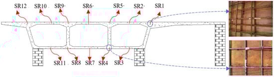 The key parameters measured during the blast tests on the box girder include overpressure from shock waves, strain on the reinforcement bars, vertical deflection, and acceleration. Figure 5 illustrates the layout of the strain gauges positioned on the rebar. The placement of measurement points for overpressure, displacement, and acceleration is shown in Figure 6.