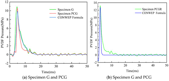 As shown in Figure 7, taking the effective measurement point PC1 at the top plate of box chamber 1 of specimens G, PCG, and PCGR as an example, the experimentally measured shock wave overpressure values were compared with those calculated using the CONWEP empirical formula. The error rates were 6.5%, 7.32%, and 6.30%, respectively. The peak overpressure values and the variation trends at the same measurement points for specimens G, PCG, and PCGR showed good agreement, confirming the validity of the applied blast loading in the experiment.