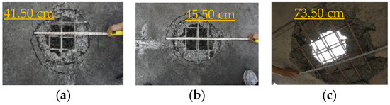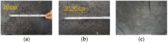 Dimensions of the hole of mid-chamber (PCG). (a) Dimensions of the hole of the top surface (longitudinal direction). (b) Dimensions of the hole of the top surface (transverse direction). (c) No damage.