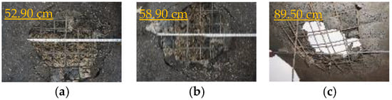 The comparison of damage patterns between repeated explosions and a single explosion on the ultra-wide box girder coated with polyurea is shown in Figure 36. As depicted in Figure 36a, after the initial 100 kg TNT blast, a through-hole appeared in the top plate center of chamber 2 of specimen PG, measuring 1.205 m along the long edge and 0.964 m along the short edge. After the second 100 kg TNT blast, the area of the through-hole increased to 2.220 m along the long edge and 2.544 m along the short edge. Similarly, in specimen PPCG, a through-hole appeared after the first 100 kg TNT blast, measuring 1.613 m along the long edge and 1.755 m along the short edge, and it was enlarged to 1.990 m by 1.734 m after the second blast. The shockwave passed through the hole, hitting the baseplate directly and causing concrete spalling on the rear face. The bending of both the transverse and longitudinal reinforcement bars around the perforation in the box girder increased, as did the permanent deformation of the bars. As shown in Figure 36b, under the condition described in Table 9 (200 kg single explosion), a through-hole formed at the center of the top plate of chamber 2 in specimen PG, measuring 1.609 m along the long edge and 1.756 m along the short edge, while the hole in specimen PPCG measured 2.014 m by 2.151 m. It can be concluded that compared to the 200 kg single explosion, both specimens PG and PPCG exhibited more severe damage under repeated explosions with two 100 kg charges, despite the same total charge. The top surface of the hole in specimen PPCG was smaller than that in PG, but the bottom surface hole in PPCG along the short edge increased significantly and was larger than in PG. This is because the energy-absorbing mechanism of the polyurea coating converts part of the internal energy into the crushing of the concrete.