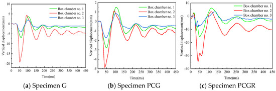 Figure 11 shows the dynamic vertical displacement curves at the center of each compartment’s baseplate for specimens G, PCG, and PCGR. Under explosive loading, all specimens exhibited a rapid increase in displacement, followed by a rebound and oscillation process, eventually stabilizing with residual deformation. For specimen G, the maximum vertical displacements at the centers of chambers 1, 2, and 3 were 8.68 mm, 19.26 mm, and 4.87 mm, respectively, with corresponding residual displacements of 2.58 mm, 4.68 mm, and 1.60 mm. This indicates that the explosive impact varied significantly across different locations, with chamber 2, located closest to the blast center, experiencing the most pronounced deformation. In the case of specimen PCG, subjected to the same explosive load, its displacement response was significantly reduced. The maximum vertical displacements in chambers 1, 2, and 3 were 2.93 mm, 4.86 mm, and 2.13 mm, with residual displacements of 0.84 mm, 1.23 mm, and 0.64 mm, respectively. Notably, the peak and residual displacements of compartment 2, directly beneath the blast center, were reduced by 74.8% and 73.7%, respectively, compared to specimen G. This clearly demonstrates the effectiveness of the polyurea coating in mitigating structural deformation induced by the explosion. For specimen PCGR, subjected to repeated explosive loads, the displacement response increased markedly. The maximum vertical displacements in compartments 1, 2, and 3 were 15.61 mm, 34.39 mm, and 8.09 mm, with residual displacements of 2.89 mm, 8.85 mm, and 2.90 mm, respectively. This highlights the significant cumulative damage effect on the box girder under repeated explosive loads, further amplifying the displacement response. In conclusion, the comparative analysis of the displacement patterns of specimens G, PCG, and PCGR reveals that while the polyurea coating effectively reduces displacement under a single explosive load, the cumulative damage effect under repeated explosive loads is substantial, leading to increased displacement response.