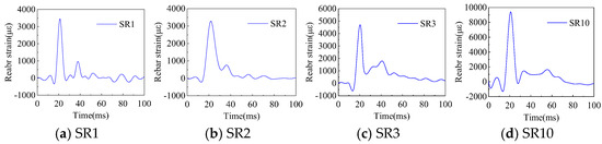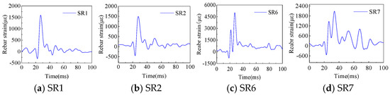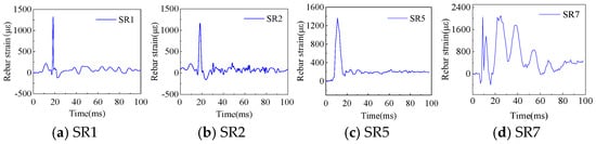 Figure 12 shows the temporal evolution curves of the rebar strain at the effective measurement points of specimen G. After the blast, the rebar strain rapidly increased to a peak value, then it underwent oscillations and gradually decayed. As the measurement points approached the blast center, the peak strain significantly increased, with residual strain observed at points SR5 and SR7, which are closest to the blast center. Figure 13 shows the rebar strain time-history curves for specimen PCG. Similarly, significant residual strain was observed at measurement points SR6 and SR7, located near the blast center. A comparative analysis of the rebar strain at corresponding measurement points in specimens G and PCG reveals a high degree of similarity in both tensile and compressive strain peaks [30]. Figure 14 shows the time–history curves of rebar strain for specimen PCGR. When comparing the corresponding measurement points in PCG and PCGR, it was observed that the peak strain during the second explosion in PCGR was markedly higher than that of the first explosion. This increase is primarily attributed to the damage and defects formed within the box girder after the first explosion, which weakened the structure’s blast resistance. Additionally, residual strain was also observed at measurement points SR1 and SR2, farther from the blast center. In summary, by comparing the time–history curves of rebar strain at different measurement points across specimens G, PCG, and PCGR, the conclusions are as follows: the peak rebar strain in the specimens is significantly influenced by the proximity to the blast center—the closer to the explosion, the higher the peak strain. Furthermore, the increased peak strain observed in specimen PCGR during the second explosion indicates the cumulative damage effect on the structure under repeated explosive loads.