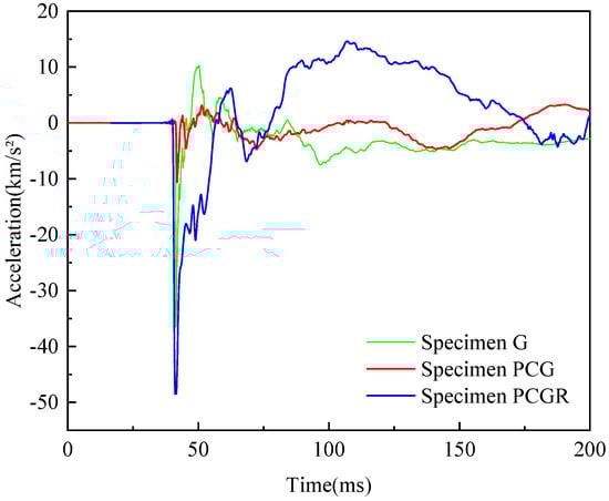 Figure 15 shows the temporal evolution curves depicting the vertical acceleration at the center of the baseplate in box chamber 2 for all specimens. The acceleration reaches its peak 42 ms after detonation, followed by oscillation and a gradual decay to zero. The recorded peak accelerations for specimens G, PCG, and PCGR were 36.5 km/s2, 10.4 km/s2, and 48.44 km/s2, respectively. Specimen PCG showed a 71.4% reduction in peak acceleration compared to G, owing to the protective effect of the polyurea coating, which mitigated the blast shockwave and decreased vertical acceleration at the baseplate. In contrast, the peak acceleration for PCGR rose by 366.3% compared to PCG under repeated explosive loads. This is attributed to the damage and defects formed in the box girder after the first explosion, which weakened its blast resistance. Furthermore, a comparison of specimens G, PCG, and PCGR indicates that the acceleration curve for specimen G exhibits the largest oscillation amplitude, which further validates the capability of the polyurea coating for reducing explosive shockwaves, thereby enhancing the overall stability of the structure.