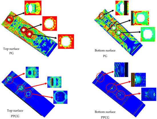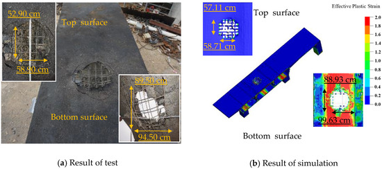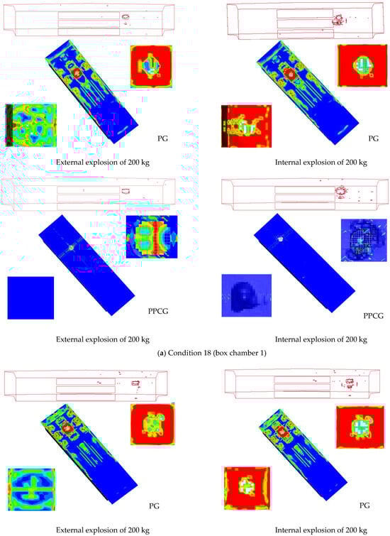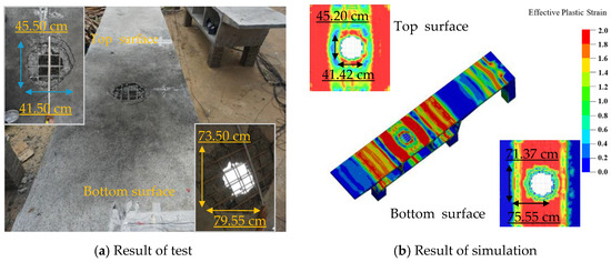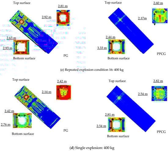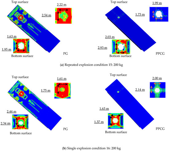 The comparison between the damage patterns of the specimens obtained from the 30 mm mesh size model and the simulated results is depicted in Figure 17, Figure 18 and Figure 19. As shown in the figure, the dimensional errors of the spalling area on the underside of the top plate of Chamber 2 for specimen G are −2.90% in the short direction and −5.03% in the long direction. For specimen PCG, the errors are −11.8% and −11.3%, respectively, while for specimen PCGR, the errors are −0.32% and 7.96%. The possible reasons for these discrepancies include uneven concrete casting and variations in the mass of the explosive. In summary, the simulated perforation and indentation on the top plate closely match the experimental findings [30].
