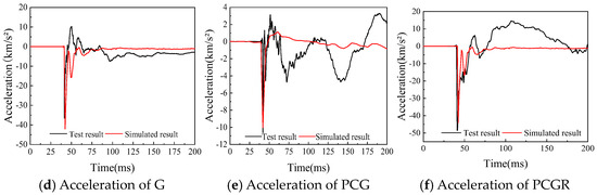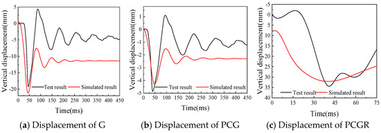 The comparison of the experimental and simulated temporal evolution curves for vertical displacement and acceleration response at the central point of the baseplate in box chamber 2 of the specimen, as presented in Figure 20. For specimen G, the peak vertical displacement and peak acceleration deviations compared to test results are 10.59% and 15.00%, respectively. For specimen PCG, the deviations are −11.73% and −4.20%, while for specimen PCGR, the deviations are −6.66% and −8.62%, respectively. These results suggest that the failure behaviors and dynamic reactions of the specimens G, PCG, and PCGR in the numerical simulations closely align with the experimental results, underscoring the reliability of the finite element model and the simulation method.