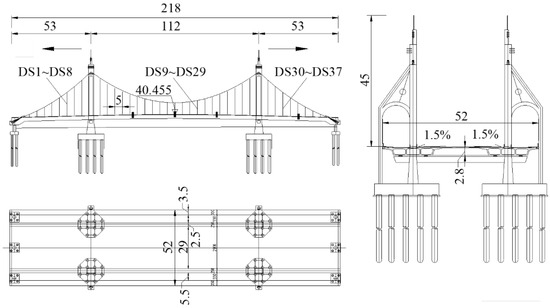 Based on the engineering background of the Hunan Road Bridge in Liaocheng, Shandong Province [36], this structure is a suspension bridge consisting of spans measuring 53 m + 112 m + 53 m, featuring twin towers and dual cable planes. The main girder consists of a prestressed concrete twin-box section, with the two box girders unified by internal cantilevers and crossbeams. The main towers feature an H-shaped configuration with solid rectangular cross-sections. A total of 37 pairs of suspension cables are employed across the bridge: 8 pairs for each side span and 21 pairs for the main span. The suspension cables are spaced at regular intervals of 5 m. The concrete has a specified strength grade of C50, while the reinforcing steel is rated at HRB400. The bridge’s overall configuration is illustrated in Figure 21.