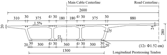 The main girder of the Hunan Road Bridge is a prestressed concrete twin-edge box girder, cast in situ using C50 concrete. The half-width girder consists of a single-box, three-cell configuration, symmetrical along the road centerline, with a height of 2.8 m at the centerline. The thicknesses of the top plate, baseplate, and web are 24 cm, 22 cm, and 35 cm, respectively. The main girder is reinforced with transverse and longitudinal prestressing tendons. The tendons are composed of high-strength, low-relaxation steel strands, each comprising 12 wires of 15.2 mm diameter strands, with a standard tensile strength of 1670 MPa. The structural layout of the half-width girder is shown in Figure 22.