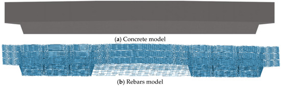A solid model of the box girder was constructed using SolidWorks and subsequently imported into HyperMesh for mesh generation. In the model, the concrete and polyurea were modeled using Solid164 solid elements, while the reinforcement was modeled using BEAM188 elements. The concrete material was defined using the *MAT_CONCRETE_DAMAGE_REL3 keyword in LS-DYNA, the reinforcement using the *MAT_PLASTIC_KINEMATIC keyword, and the polyurea using the *MAT_PIECEWISE_LINEAR_PLASTICITY keyword. The coupling of degrees of freedom between concrete and reinforcement was achieved using the CONSTRAINED_BEAM_IN_SOLID keyword in LS-DYNA. Shared nodes were applied between the concrete and polyurea without considering interface debonding. As an example, the finite-element model for specimen PCG is illustrated in Figure 16. Explosion loads were applied using the *LOAD_BLAST_ENHANCED (LBE method) and *LOAD_SEGMENT_SET keywords in LS-DYNA. The explosion center was positioned 0.4 m directly above the center of the second box chamber, with a TNT equivalent of 3 kg, corresponding to a scaled distance of 0.31 m/kg^1/3. Based on observations from the blast test results of specimen G, no sliding or separation occurred between the support and the baseplate of the box girder. In the numerical simulation, the nodes between the baseplate of the box girder and the support were connected with shared nodes, and the bottom of the support was set as fully constrained. Considering both mesh accuracy and computational efficiency, the mesh size for the concrete and reinforcement was set to 30 mm [30].