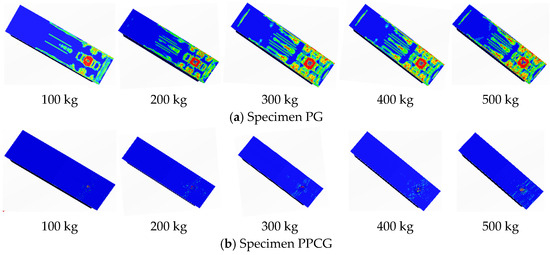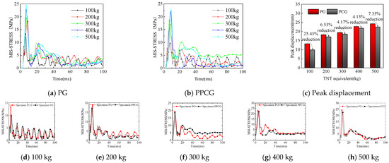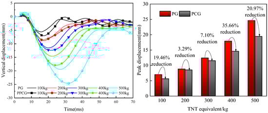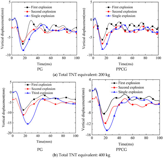As shown in Figure 37b, the peak vertical displacement in chamber 2 of specimen PG under the first 200 kg explosion was 8.67 mm, and under the second explosion of the same charge, it was 7.61 mm, with a total displacement of 16.28 mm. Under a single 400 kg explosion, the peak displacement was 15.52 mm. For specimen PPCG, the peak vertical displacement was 8.45 mm under the first 200 kg explosion and 8.94 mm under the second explosion, resulting in a total displacement of 17.39 mm. The peak displacement under a single 400 kg explosion was 14.37 mm. Thus, compared with a single 400 kg explosion, the displacement increases for PG and PPCG specimens under two 200 kg repeated explosions were 4.67% and 17.37%, respectively. Comparing the PG and PPCG specimens under two 200 kg repeated explosions, the displacement decreased by 11.73%.