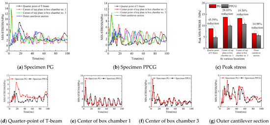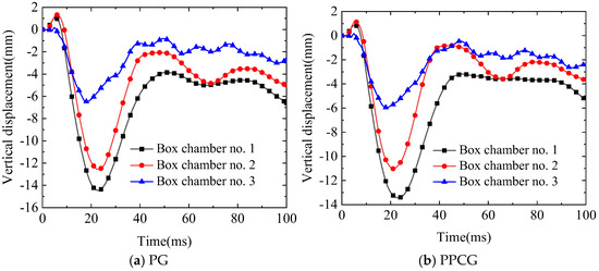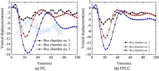 Figure 37 compares the temporal evolution curves of vertical shift at the center of the baseplate in the super-wide box girder subjected to repeated and single explosions. As shown in Figure 37a, under the first explosion of 100 kg on specimen PG, the peak vertical shift of the baseplate in chamber 2 was 6.83 mm, and under the second explosion of 100 kg, the peak displacement was 3.92 mm, resulting in a total displacement of 10.75 mm for both explosions. Under a single 200 kg explosion, the peak vertical displacement was 8.67 mm. For specimen PPCG, the peak vertical displacement was 5.66 mm under the first 100 kg explosion and 4.64 mm under the second explosion, with a total displacement of 10.30 mm. In contrast, the peak displacement under a single 200 kg explosion was 8.45 mm. Therefore, the increase in displacement under two 200 kg repeated explosions, compared to a single 400 kg explosion, was 19.34% for PG and 17.96% for PPCG. Under two 100 kg repeated explosions, the displacement decreased by 4.19% when comparing PG and PPCG specimens.