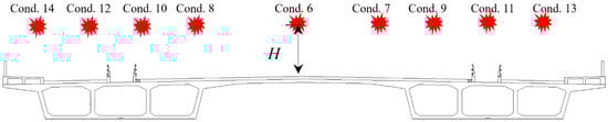 As discussed in Section 2.3.2, the initial blast load causes localized damage to the reinforced concrete box girder and leads to material degradation focused on the explosion center. Under repeated blast loading, the box girder sustains progressively more severe damage. A comparative analysis was performed to investigate the failure characteristics of ultra-wide box-girder segments under both single and repeated explosion scenarios. Details of the calculation conditions are provided in Table 9.