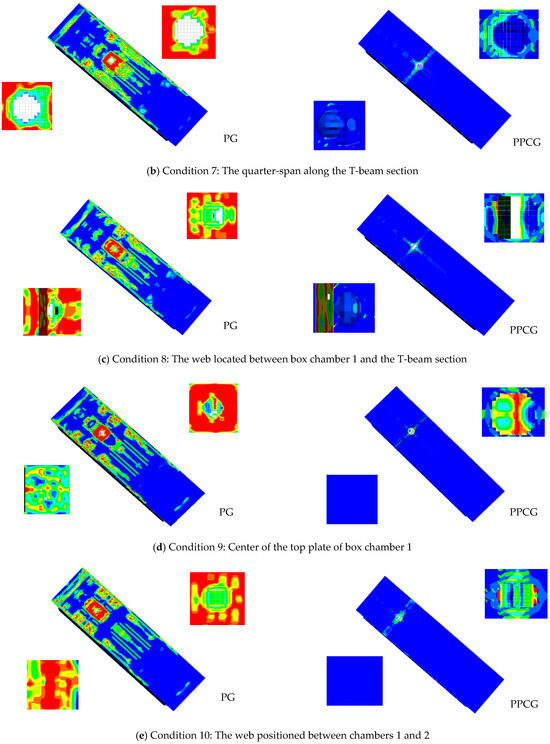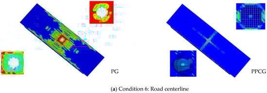 Figure 40 illustrates the damage characteristics of the polyurea-coated box girder under simultaneous detonation at multiple points. It can be observed from the figure that local perforations appeared on the top plate below the explosion centers in specimen PG, and the plastic strain was greatest near the perforations. The local strain gradually diffused outward and diminished. Due to the short distance from the T-beam center and the quarter-span points, a high-strain region connected the undamaged areas between the two perforations during simultaneous detonation. In specimen PPCG, the top plate under each explosion center was not fully perforated, and concrete spalling occurred on the top surface. Minor polyurea delamination and slight perforations were observed at the central and quarter-span points. The results indicate that simultaneous detonation at multiple points caused damage along the transverse axis of the bridge, reducing its overall strength and stability and significantly affecting its traffic capacity. However, after coating with polyurea, the overall blast resistance of the box girder was greatly enhanced, and it retained a certain level of traffic capacity.