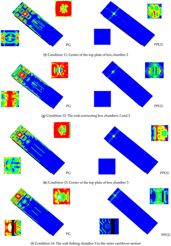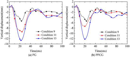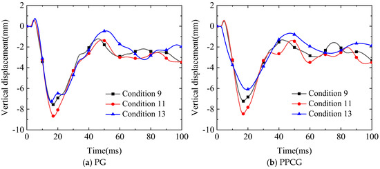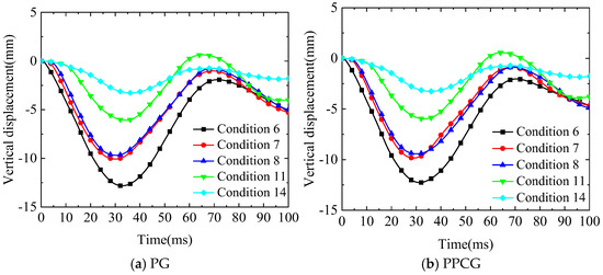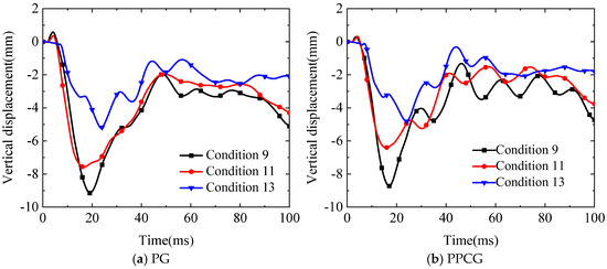 When the blast is located over the middle of the T-beam section, at the quarter-span, above the innermost web, over the center of the box girder, and above the outermost web, the temporal evolution curves of vertical displacement beneath the transverse diaphragms are shown in Figure 35. The vertical displacement trends for specimens PG and PPCG were generally consistent across various test conditions. Under test conditions 6, 7, 8, 11, and 14, the peak vertical displacements at the bottom of the transverse diaphragm for specimen PG were 12.82 mm, 10.07 mm, 9.67 mm, 6.08 mm, and 3.27 mm, respectively, while the corresponding peak vertical displacements for specimen PPCG were 12.26 mm, 9.84 mm, 9.46 mm, 5.97 mm, and 3.25 mm, respectively. Specimen PPCG exhibited reductions in peak displacements of 4.37%, 2.28%, 2.17%, 2.17%, and 0.61%, respectively, in comparison to specimen PG. Among these conditions, the highest peak vertical displacement observed at the bottom of the transverse diaphragm was in condition 6, with the explosion centered over the middle of the T-beam section, followed by condition 7, where the explosion occurred at the quarter-span of the T-beam section. The lowest peak displacement was observed in condition 14, where the explosion was positioned between the web of the third box chamber and the outer cantilever section. The results indicate that the peak shift of the box girder just beneath the explosion epicenter, as well as the effectiveness of the polyurea coating in blast resistance, both decrease consistently from the middle of the T-beam section outward towards the outermost web. This indicates that the middle T-beam section is the weakest point in blast resistance for the polyurea-coated twin-chamber box girder. Overall, the specimen PPCG coated with polyurea exhibited improved blast-resistance performance across different test conditions, as evidenced by the relative reduction in peak vertical displacements at the bottom of the transverse diaphragm in comparison to the uncoated specimen PG.