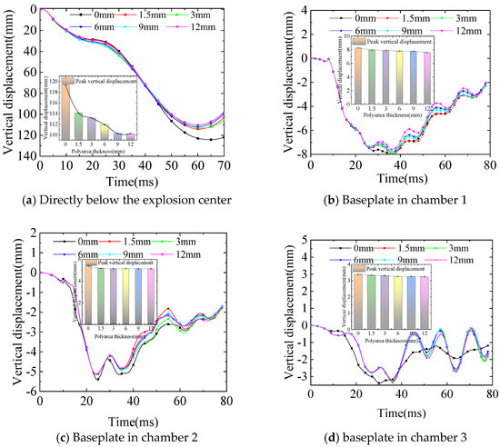 Vertical displacement of the baseplates of different box chambers under various polyurea coating thicknesses.