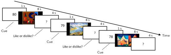 The study was performed in the Bioelectric Brain Imaging Laboratory of the Faculty of Information Technology at the University of Pannonia. Participants were seated in a dimly lit room in front of the computer monitor used to display the paintings at a comfortable viewing distance (80–90 cm). The paintings were scaled to fit the display height of the monitor (1080 pixels). The sequence and timing of the experiment is as follows (also shown in Figure 1). Each painting was displayed for 8 s after a 1 s cue mark showing the remaining number of paintings in the experiment. This was introduced to maintain subjects’ attention and help them focus on the center of the screen. Paintings were presented in a random order unknown to the subjects. After the 8 s presentation, a blank black screen appeared for 4 s during which the subject had to press either the left or right mouse button with their right hand’s index or middle finger, respectively, to indicate a ‘Like’ or ‘Dislike’ response. The measurements took place in a single session for each subject without breaks. The presentation and control of the experiment were conducted by a custom script executed in the Psychtoolbox-3 (Psychophysics Toolbox Version 3) software package [35].