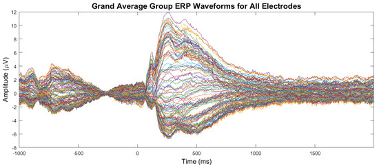 Grand average group ERP waveforms of all electrodes in the figurative condition. Time 0 represents the presentation of the stimulus that lasts 8 s. Note the amplitude peaks at 100 and 300 ms and the drop at 900 ms onwards. Different waveform colors represent different EEG channels.