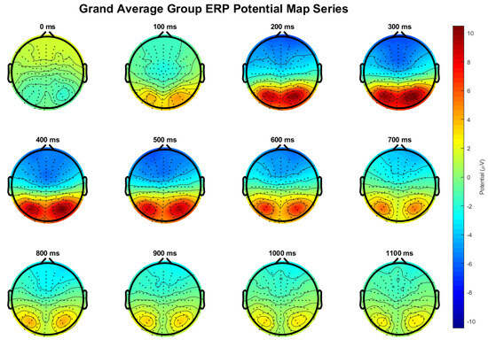 Grand average group ERP map series from 0 to 1100 ms post-stimulus in the figurative condition. Values are in μVolts. Note the dominance of occipital areas throughout the time interval with hardly any detectable activity in other areas.