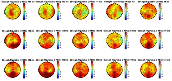 Table 1 highlights the strong statistical evidence for the increased connectivity differences between the abstract and figurative conditions, spanning the time interval from the baseline (−300 ms) to 500 ms post-stimulus across multiple frequency bands. All the connectivity differences in Figure 6, Figure 7, Figure 8, Figure 9 and Figure 10 are highly significant with the p-values being (p < 0.05) for both the figurative > abstract and abstract > figurative comparisons across all the frequency bands and time points. Table 1 lists the mean p-values of the significant network edges.