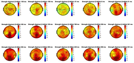 The interpolated full-band node strength topography map time series of the abstract condition. Time starts at 150 ms pre-stimulus and stops at 550 ms post-stimulus. Stimulus is presented at 0 ms, time step is 50 ms.