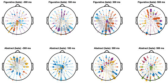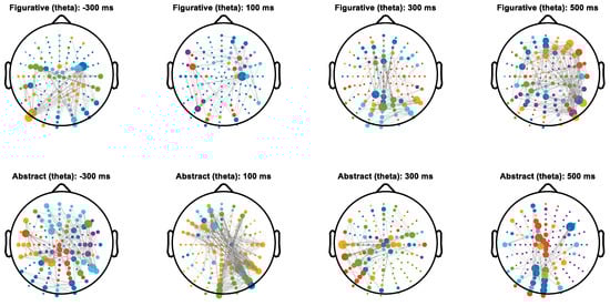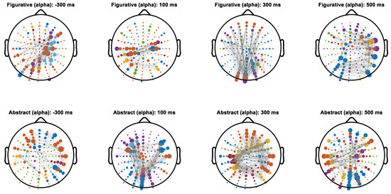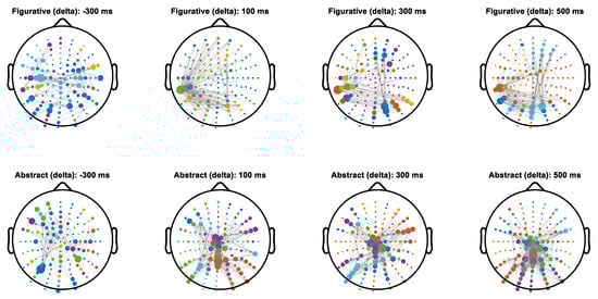 For the connectivity network analysis, we selected three key time points (100, 300 and 500 ms), aligning with past studies [43,45,46,47] and with the main peaks found in our ERP waveform (Figure 2). The analysis based on the edge weights of the functional connectivity networks found significant differences between the abstract and figurative conditions across all the time points and frequency bands. A significant difference in connectivity represents an increase in network edge weight that in turn represents an increase in phase synchronization (stronger communication) between brain regions.