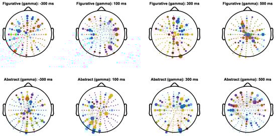 The gamma band shows distinct temporal dynamics for both the abstract and figurative connections (Figure 10). Initially, at 100 ms, the figurative condition (p = 0.0245) exhibits increased connectivity with prominent nodes in the frontal and temporal regions, while for the abstract condition (p = 0.0252), the connectivity is mainly in the right frontal and left parieto-occipital regions, with relatively larger node strengths appearing in those areas. As processing continues to 300 ms, the figurative condition (p = 0.0254) displays extensive connections across the cortex, with larger nodes appearing in both the right frontal and occipital areas. The connections in the abstract condition (p = 0.0253) are more distributed in the frontal and occipital regions, similar to those seen at earlier time points but shifting to the right hemisphere. By 500 ms, the figurative condition (p = 0.0248) presents a more centralized connectivity whereas the abstract condition (p = 0.0245) shows widespread connectivity, particularly in the frontal and left temporal regions.