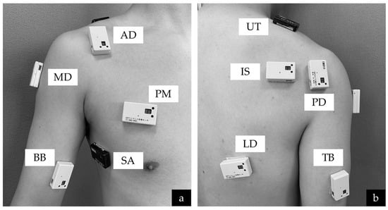 Surface EMG was performed using the same electrodes used to measure the acceleration. Because the assumption of bilateral symmetry is considered valid for wheelchair propulsion motion in healthy participants without upper limb pain or disability [20], this study measured muscle activity only on the dominant side. As shown in Figure 1, the electrodes were attached to a total of 10 muscles: latissimus dorsi (LD), AD, MD, PD, BB, TB, IS, PM, UT, and serratus anterior (SA) [11]. The electrode placements were based on previous studies [21,22]. Before attaching the electrodes, the skin was rubbed with alcohol cotton to reduce impedance. Acceleration and surface EMG data were synchronized by unifying the sampling frequency of the electrodes at 1000 Hz.
