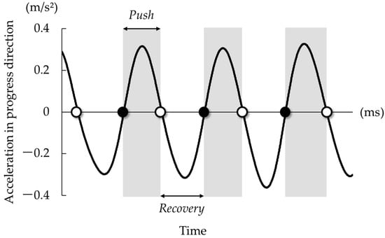Identification of the propulsion phase by the acceleration data. Black circles (●) indicate the start of the push phase and white circles (○) indicate the start of the recovery phase. This means that the period from the black circle to the white circle (the gray-colored area) represents the push phase.