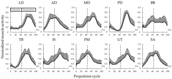 The AD, BB, PM, and SA were more active from the beginning of the PP, reaching peak activities at 44%, 41%, 46%, and 53% of the propulsion cycle, respectively. The LD, MD, PD, TB, IS, and UT were highly active in the RP; the LD and PD were active at the beginning of the RP, peaking at 69% and 70% of the propulsion cycle, respectively. The MD, TB, IS, and UT gradually increased from the end of the PP, with the MD at 66%, the TB at 61%, the IS at 68%, and the UT at 71%, showing the highest activity in the RP.