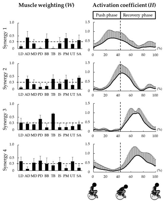 A limitation of this study was the small sample size and the fact that the participants had no previous experience driving a wheelchair for WB. Because of the lack of familiarity with the propulsion motion, demonstrating the validity and reliability of the muscle synergies extracted in this study remains a topic for future studies. Furthermore, there are limited data on kinematic variables, such as joint angles and moments during wheelchair propulsion motion; therefore, this study was limited to a discussion of muscle activity. If we could clarify the relationship between the muscle synergy patterns and kinematic variables, we could obtain more useful information that would assist in understanding wheelchair propulsion motion.