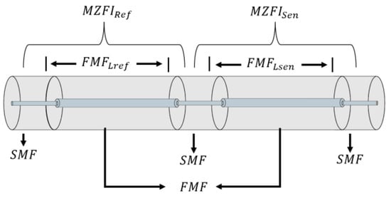 where Δ represents the length mismatch factor, “i” is a positive integer corresponding to the harmonic order, and OPLSen and OPLRef are the optical path lengths of the sensor and reference interferometers, respectively. According to previous studies, Equation (7) can be related to the FMF lengths as follows: