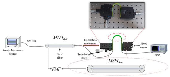 Five different concatenated MZFI tandems with varying lengths for LRef and LSen were examined. The specific lengths of LRef and LSen, along with their respective FSRs and M factor, are summarized in Table 1. For each measurement, the Yokogawa AQ6370B optical spectrum analyzer (OSA) was configured with a resolution of 0.05 nm. The sensor fabrication process was as follows: First, the FMF sections were measured using the dimensions specified in Table 1. They were then cut with a high-precision optical fiber cleaver. The cut FMF sections were spliced with a Fujikura FSM-60S splicer between two SMFs. This process was carried out twice, as shown in Figure 3, to obtain the cascaded MZFIs. The MZFIRef was fixedly placed in the work area, while the second MZFISen was introduced into the TPU tubular structure to correlate the linear displacement with respect to the envelope displacement.