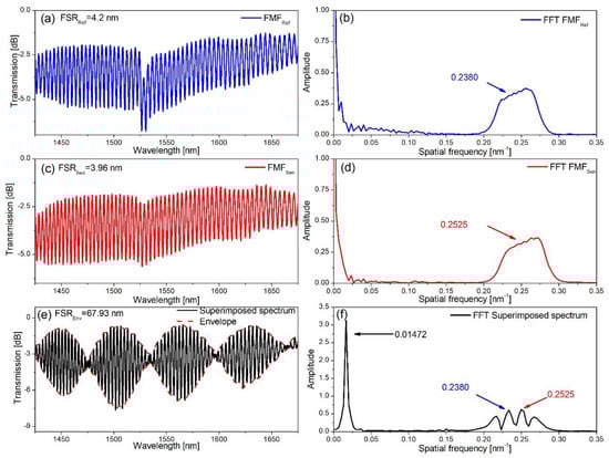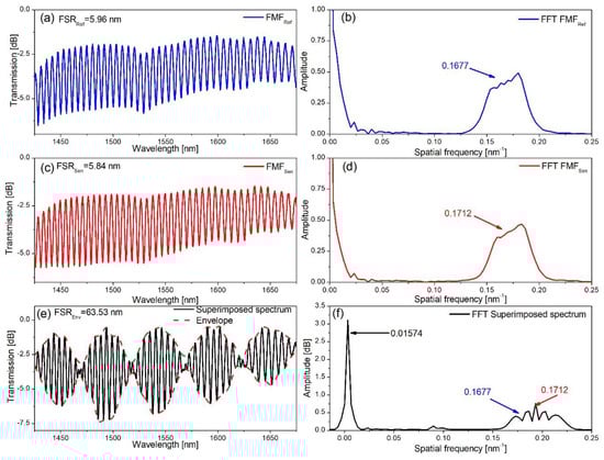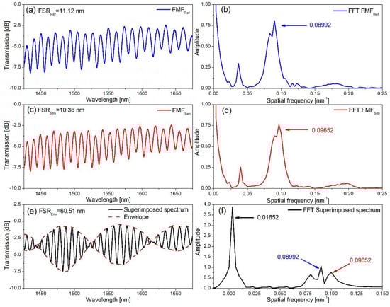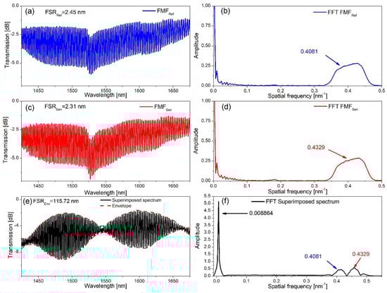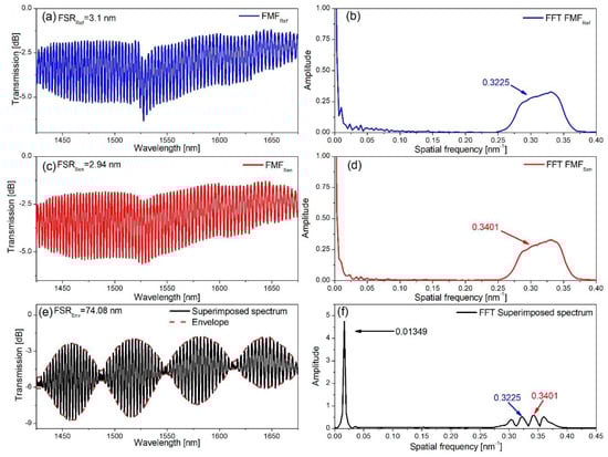 Figure 4, Figure 5, Figure 6, Figure 7 and Figure 8 illustrate the frequency analysis for the corresponding devices listed in Table 1. In each figure, panels (a), (c), and (e) present the transmission spectra for FMFRef, FMFSen, and the superimposed spectrum (envelope), respectively. It is noteworthy that the FSRRef and FSRSen must be closely matched to generate an envelope with a significantly larger FSREnvelope when superimposed. Panels (b), (d), and (f) in Figure 4, Figure 5, Figure 6, Figure 7 and Figure 8 display the spatial frequencies corresponding to the transmission spectra. Panels (b) and (d) in Figure 4, Figure 5, Figure 6, Figure 7 and Figure 8 highlight the dominant frequencies produced by the MZFIRef and MZFISen, characterized by their regularity and consistency. In panels (f) in Figure 4, Figure 5, Figure 6, Figure 7 and Figure 8, three key peaks are observed: one representing the superimposed spatial frequency of the envelope (the smallest peak) and the two adjacent peaks corresponding to the individual interferometer components. The frequency results are summarized in Table 3.