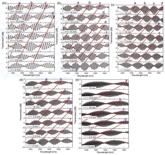 These results demonstrate that the lengths of the FMFRef and FMFSen significantly impact the amplification of the OVE, as well as the sensor’s usable range and sensitivity. With each incremental increase in FMFRef and FMFSen lengths, there is a corresponding amplification in the FSRenvelope, enhancing the detection system’s sensitivity, as seen in Figure 10a–e. However, as the FSRenvelope increases significantly, the complete range of spectral shift becomes too large to capture within the optical spectrum analyzer’s (OSA) measurement window, as shown in Figure 9a–e. This limitation means that a higher sensitivity comes at the cost of a reduced measurement range. For instance, in Figure 9b, the range is reduced by 2.5 mm (from 0–12.5 mm), while in Figure 9c,d, a 5 mm reduction (from 0 to 10 mm) is observed. In Figure 9e, the range is further reduced by 10 mm (from 0 to 5 mm).