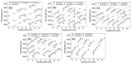 The spectral shift of the envelopes as a function of linear displacement was subsequently analyzed. To ensure a fair comparison, all devices were calibrated over a displacement range of 0 to 15 mm, with intervals of 2.5 mm. The resulting spectral shifts are illustrated in Figure 9, while the corresponding sensitivities are displayed in Figure 10. The experiment numbers 1 through 5 from Table 1 correspond to Figure 9a–e and Figure 10a–e, respectively.