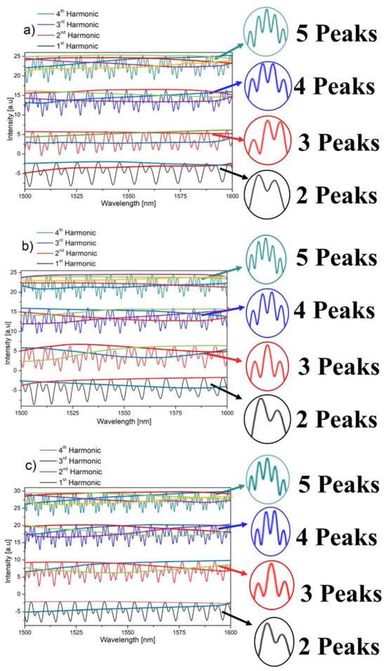 Due to the limitations highlighted in previous studies [14], the technique of tracking internal envelopes is applied. Therefore, by grouping the peaks of the harmonic spectrum, the maxima of the internal envelopes are obtained and classified into peaks of i + 1, where “i” represents the harmonic order. The intersections between these internal envelopes provide multiple points that can be used to track wavelength shifts. As the harmonic order “i” increases, the internal envelopes increase proportionally in number and FSR range, facilitating spectral change detection by monitoring these envelope intersections.