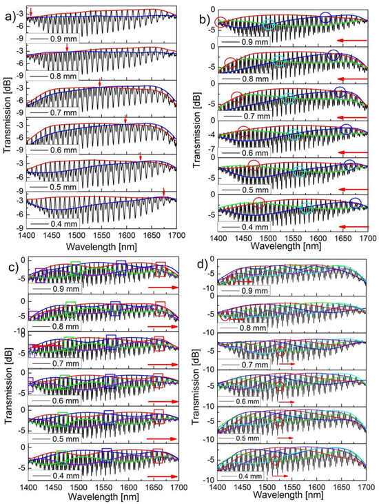 Spectral shift due to linear displacement. The red arrow indicates the wavelength shift: (a) first harmonic (one intersection); (b) second harmonic (three intersections); (c) third harmonic (six intersections); (d) fourth harmonic (multiple intersections).