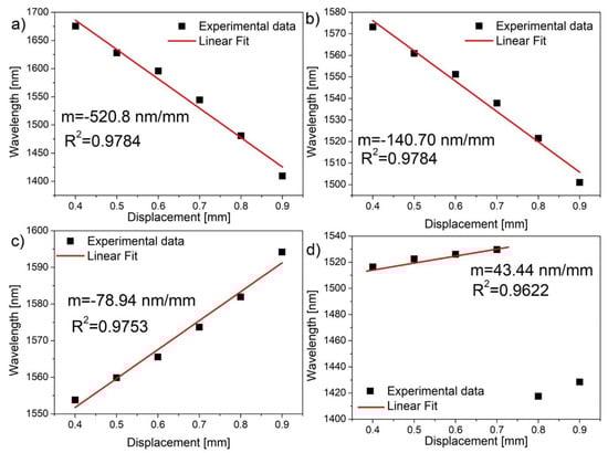 A displacement analysis was performed with the first device from Table 2. A linear displacement ranging from 0.4 mm to 0.9 mm, in 0.1 mm intervals, was applied. The spectral shifts are shown in Figure 12, and the sensitivities are shown in Figure 13. Figure 12 demonstrates that as the harmonic order increases, more intersection points of the internal envelopes are obtained. However, the downside is that sensitivity decreases, as observed in Figure 13. One factor to consider is that, due to the cyclical behavior, if an appropriate range is not selected, the displacement may be “cut off” within the OSA span, as occurred in Figure 12 and Figure 13d.
