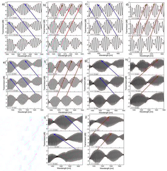 To verify the high repeatability of this behavior, five additional MZFI concatenations were performed with FMFRef lengths longer than FMFSen, followed by reversed lengths with FMFRef shorter than FMFSen, as detailed in Table 4. The results are plotted in Figure 14. To ensure consistency and uniformity in analysis, all devices were tested over a displacement range of 0 to 3 mm, with increments of 1.5 mm. The devices were labeled according to the observed envelope displacement. Labels in Figure 14a,c,e,g,i correspond to configurations where FMFRef lengths are greater than FMFSen lengths, and the red arrows indicate a Blueshift. Conversely, labels in Figure 14b,d,f,h,j correspond to configurations where FMFRef lengths are shorter, and the blue arrows indicate a Redshift. It should be noted that slight variations in arm lengths cause phase differences that generate complex interference patterns, thereby affecting the regularity of the envelope curve without impacting the accuracy of the displacement measurement, as observed in Figure 14.