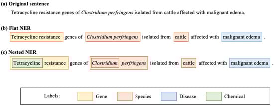 The flat NER identifies NEs defined by a single span of consecutive words without overlapping and nesting with other entities [15,28]. For example, as shown in Figure 1a,b, the flat NER model recognizes four entities in the given sentence: “Tetracycline resistance” as a gene; “Clostridium perfringens” as a species; “cattle” as a species; and “malignant edema” as a disease. A primary approach used in flat NER is sequence labeling, which generates a sequence of labels for an input sentence, creating one-to-one input-output pairs. The labeling scheme for this approach includes IO, BIO, BIOES, and BILOU, according to the combination of labels [29,30,31]. For example, the BIO scheme consists of three labels: B, I, and O. The label B indicates the beginning of the NE (i.e., the first word), and the label I indicates all other words in the span of the NE. The label O is used for words that are not part of any NE. For instance, when annotating a gene “Tetracycline resistance genes” using the BIO scheme, “Tetracycline” would be labeled as “B-gene”, and both “resistance” and “genes” would be labeled as “I-gene”. Additionally, the BIOES scheme extends the BIO scheme by including the label S for a single-word NE and the label E for the last word of the NE.
