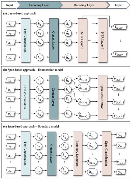 Hereafter, models are introduced based on a two-step structure consisting of encoding and decoding layers, as illustrated in Figure 2. The encoding layer includes a text vectorization layer and a context layer. The text vectorization layer converts words or tokens into numerical vectors. The context layer enhances the ability of the model to understand the broader linguistic context by employing neural networks, such as long short-term memory (LSTM) or transformer-based language models. Lastly, the decoding layer aims to predict NEs based on context information from the encoding layer. The configuration of this layer varies depending on the specific approach to handling NEs.
