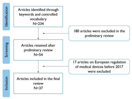 Initially, 234 related articles were found. A preliminary review was conducted, where the most relevant articles were considered for the present article. In addition, given the significant changes in European medical device legislation with the introduction of the MDR in 2017, we excluded all the articles discussing European legislation that were published before this date, to ensure that the review would reflect the current regulatory environment and avoid outdated information. After carrying out this process, we obtained 37 articles, which were evaluated and included for their significant contribution to understanding the regulatory frameworks of medical devices in the EU, US and Japan. Figure 1 provides a flowchart of the selection of the reviewed articles.