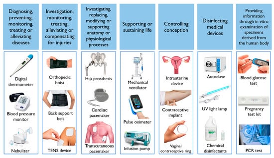 These products can be used by healthcare professionals and non-healthcare professionals (e.g., patients, relatives, etc.) for various purposes, including diagnosing, preventing, monitoring, treating or alleviating diseases; investigation, monitoring, treating, alleviating or compensating for injuries; investigating, replacing, modifying or supporting anatomy or physiological processes; supporting or sustaining life; controlling conception; disinfecting medical devices; and providing information through the in vitro examination of specimens derived from the human body [20,21]. Figure 2 shows some examples of medical devices according to their respective purpose.