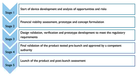 The development and manufacture of medical devices is a complex and demanding process that requires precise specifications and high-quality standards to ensure that the final product complies with stringent legal regulations. Furthermore, this process must be meticulously documented to uphold quality and facilitate reproducibility. Several stages are included in this process, as shown in Figure 3, that guide the transition from a conceptual design to a fully functional product ready for use in the medical industry [2,3].