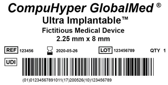 The Unique Device Identification (UDI) system, established by the FDA Amendments Act of 2007 and further defined by the Food and Drug Administration Safety and Innovation Act of 2012, plays a crucial role in identifying and tracking medical devices throughout their lifecycle [61]. Each device has a distinct UDI alphanumeric code containing standardized information, allowing the formal identification of each device and giving access to detailed data in the Global Unique Device Identification Database (GUDID) [34,44,61,62]. Figure 8 provides an example of an UDI in the USA.