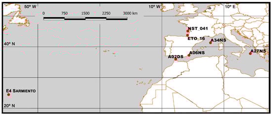 Sampling sites in the Western Atlantic Ocean, Bay of Biscay, Strait of Gibraltar and Mediterranean Sea.