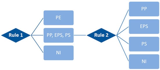 Using Principal Component Analysis (PCA) as an exploratory analysis, the most effective preprocessing techniques that permit class separation have been identified. More in detail, the performance of the selected pre-processing algorithms for the hierarchical classification model rules was evaluated. Indeed, the hierarchical model was built based on 2 different rules. Each rule is characterized by the application of different pre-processing algorithms (i.e., Normalize, Standard Normal Variate (SNV), Detrend and Mean Centering (MC)), as shown in Table 2, to optimize the recognition of the different polymers constituting microplastic particles. In more detail, Rule 1 is defined using the Normalize, SNV, Detrend, and MC algorithms, whereas Rule 2 incorporates the Detrend, Normalize, and MC preprocessing methods. In Rule 1, three categories were discriminated: PE, the polymer mix (i.e., PP, EPS, PS) and not identified (NI). PP, EPS, PS are considered as only one class since these three polymers share more similar characteristics: preprocessing is applied to distinguish them from PE. Then, Rule 2, by applying additional preprocessing steps, identifies each single polymer in the mix and NI.