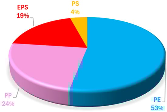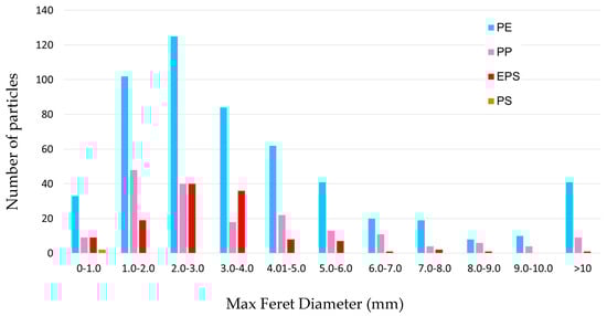 Approximately 70.6% of the microplastic fragments showed a Feret diameter (FD) lower than 5 mm (Figure 13), in agreement with the standard definition of microplastics. Considering the maximum FD for the rigid fragments, PE is the dominant polymer in all the size ranges. PE particles peaked between 2 and 3 mm, PP peaked between 1 and 2 mm, whereas EPS particles showed the highest abundances from 3 to 4 mm. Therefore, the distribution of EPS was shifted to larger sizes in comparison to those of PE and PP. Furthermore, all the PS particles have FD in the smallest size class (0–1 mm). These results are very consistent with previously published findings, where the analyzed PE particles peaked at 2–3 mm and PP at 1–2 mm [42].
